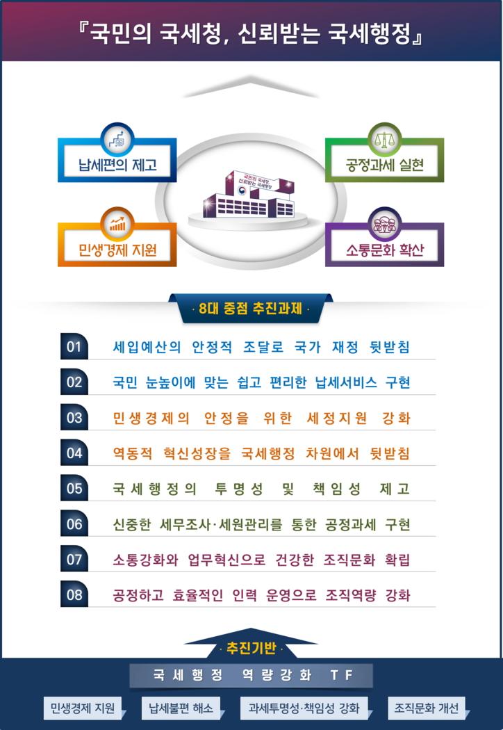 김창기 국세청장이 7. 22.(금) 취임 후 첫 전국 세무관서장 회의를 개최했다. 국세청은 이날 ‘국민의 국세청, 신뢰받는 국세행정’을 구현하기 위해 8대 중점 추진과제와 운영방안을 확정하고 적극 실천하기로 결의했다. 김창기 국세청장의 첫 관서장회의 주요 화두는 경제활력 지원과 신중한 세무조사였다. 경제활력 지원은 민생과 경제를 최우선 과제로 추진하고 있는 정부의 의지를 반영한 국세청의 고민으로 이해된다. 그러나 신중한 세무조사의 천명은 다소 의아하다. 세무조사 축소가 경제활력을 지원한다는 논리는 비약이 과하다.