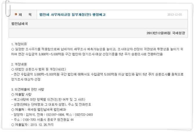 국세청은 지난달 18일 ‘국민 신뢰 회복을 위한 국세행정 쇄신방안’의 하나로 신설한 세무조사감독위원회가 개최한 첫 회의에서 대기업 법인에 대한 순환조사 방식을 3000억 원 이상 법인으로 확대키로 했던 방안의 후속으로 관련 법인세 사무처리 규정 개정 작업에 착수했다.