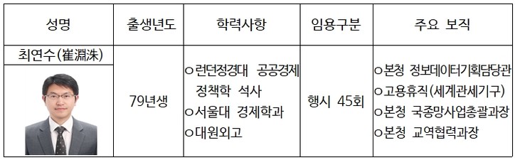 ■ 부이사관 승진(2022년 10월 7일자) △ 관세청 기획재정담당관 최연수 (崔淵洙) [프로필] 최연수 부이사관 승진자 김승현 기자 raon@sejungilbo.com 기자의 다른기사 저작권자 © 세정일보 무단전재 및 재배포 금지 최신 기사 차규근 “배당소득 분리과세율 인하 수용못한다…초부자 감세, 불평등만 심화” 관세사회, 우원식 국회의장 면담…성실신고확인제 필요성 설명 [현장] ‘국세공무원의 꽃’ `25년 하반기 서기관 승진자 30명에 임명장 수여식 국세청, ‘기획·정보·대변인실’ 사무관 자리 하나씩 늘린다 동아쏘시오그룹, 중대재해 대응 모의훈련 실시···심폐소생술·자동심장충격기 실습 NH농협은행, 2025년 ‘디지털금융 혁신대상‘ 최종 우수사례 선정 韓 3분기 경제성장률 26개국 중 3위…내년 2.3% 전망도 등장 차규근 “배당소득 분리과세율 인하 수용못한다…초부자 감세, 불평등만 심화” 추천기사 국세청, 태광산업 세무조사 ‘인프라·레저 계열사’까지…‘5년 치 장부’ 뒤진다 론스타와 13년 분쟁, 국제투자분쟁에서 최초 ‘대한민국 승’…조세주권 지켰다 국세청, 세무공무원 출신 세무사 등 ‘세금 유튜버’ 전수 확인했다 상속세 과세, 유산취득세로 변경 시 ‘국세청 세무조사 조항’도 바뀐다 '마약의 나라' 되나?…청년층 타깃 클럽마약 '케타민의 급습' 5년간 7.3배 급증 [세미콜론] 아직도 이런 폐습이~…국세청 ‘간부 모시는 날’ 고강도 감찰