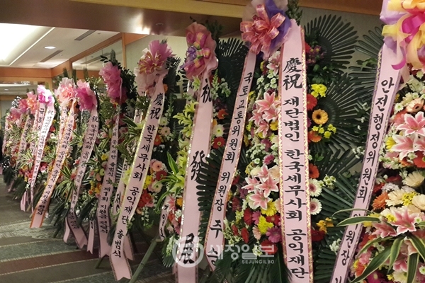 한편 이날 공익재단 출범식에는 한국세무사회가 가지는 행사의 특징인 국회의원들의 대거 출현이 또 눈길을 끌었다. 참석한 국회의원들의 숫자만 20명을 넘었고, 국회의원들이 보낸 축하화환도 즐비했다. 이날 3시를 몇 분 남겨놓은 시점에서 축사에 나선 나성린 국회 조세소위원장은 “3시에 국회 조세소위를 소집해 두었는데, 소위 위원들이 5명이나 이 자리에 참석해 있다”면서 국회의원들의 대거 참석을 에둘러 지적하기도 했다.