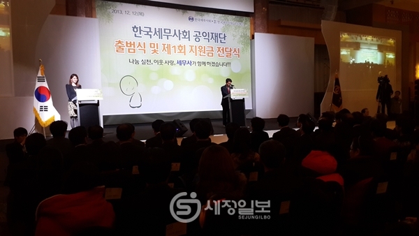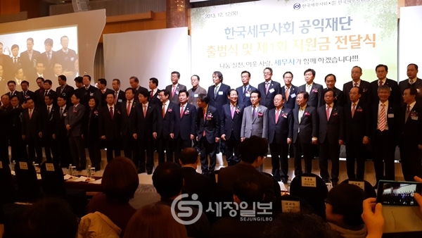 한국세무사회는 이날 오후 2시 서울 반포동 JW메리어트 호텔에서 한국세무사회 공익재단 출범식 및 제1회 지원금 전달식을 갖고 우리사회 소외계층과 저소득층 350명에게 생활비와 장학금으로 3억5천만 원을 전했다.