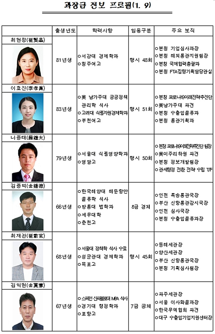 5일 관세청은 9일자, 10일자, 16일자 등 순차적으로 과장급 전보인사를 단행했다.