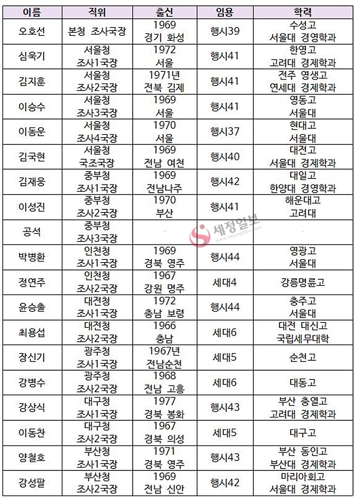 이외에는 김국현 중부청 2국장, 양동훈 3국장, 정용대 대전청 1국장, 오미순 2국장, 최영준 광주청 조사1국장, 최재훈 2국장이 호남 출신이었다.