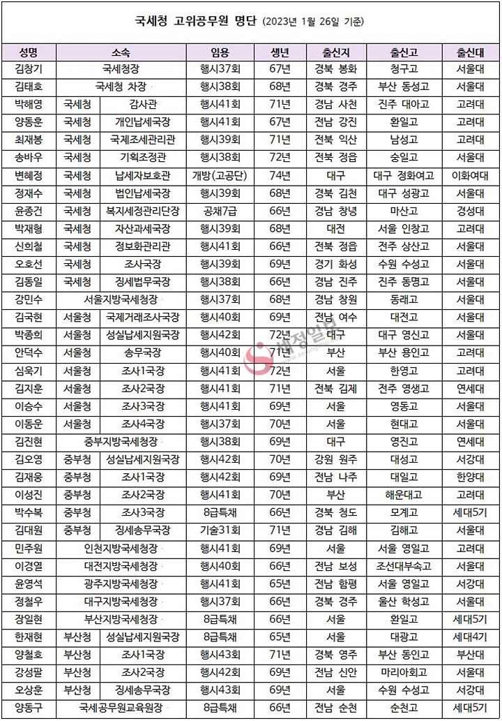 한편, 정무직인 김창기 국세청장은 행시37회, 경북 봉화, 서울대 출신이다.