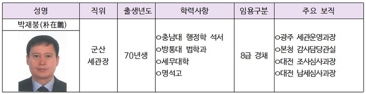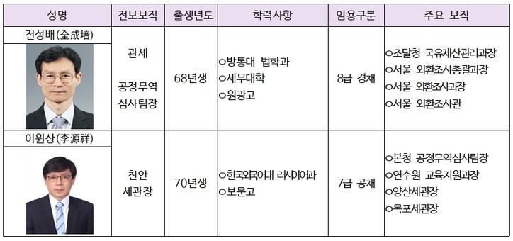 ■ 과장급 전보 프로필(2.15) ■ 과장급 전보 프로필(2.16) ■ 과장급 전보 프로필(2.17) ■ 과장급 전보 프로필(2.21) ■ 과장급 전보 프로필(2.22) 권종일 기자 jikwon@sejungilbo.com 기자의 다른기사 저작권자 © 세정일보 무단전재 및 재배포 금지 관련기사 [관세청 인사] 과장급 전보(11명) 최신 기사 차규근 “배당소득 분리과세율 인하 수용못한다…초부자 감세, 불평등만 심화” 관세사회, 우원식 국회의장 면담…성실신고확인제 필요성 설명 [현장] ‘국세공무원의 꽃’ `25년 하반기 서기관 승진자 30명에 임명장 수여식 국세청, ‘기획·정보·대변인실’ 사무관 자리 하나씩 늘린다 동아쏘시오그룹, 중대재해 대응 모의훈련 실시···심폐소생술·자동심장충격기 실습 NH농협은행, 2025년 ‘디지털금융 혁신대상‘ 최종 우수사례 선정 韓 3분기 경제성장률 26개국 중 3위…내년 2.3% 전망도 등장 차규근 “배당소득 분리과세율 인하 수용못한다…초부자 감세, 불평등만 심화” 추천기사 국세청, 태광산업 세무조사 ‘인프라·레저 계열사’까지…‘5년 치 장부’ 뒤진다 론스타와 13년 분쟁, 국제투자분쟁에서 최초 ‘대한민국 승’…조세주권 지켰다 국세청, 세무공무원 출신 세무사 등 ‘세금 유튜버’ 전수 확인했다 상속세 과세, 유산취득세로 변경 시 ‘국세청 세무조사 조항’도 바뀐다 '마약의 나라' 되나?…청년층 타깃 클럽마약 '케타민의 급습' 5년간 7.3배 급증 [세미콜론] 아직도 이런 폐습이~…국세청 ‘간부 모시는 날’ 고강도 감찰