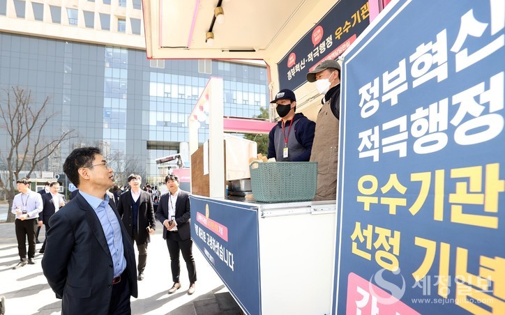 21일 국세청(청장 김창기)은 ’22년도 정부업무평가 우수기관 선정을 기념하기 위해 세종시 본청 앞 공간에서 직원 대상 ‘간식차 행사’를 실시했다고 밝혔다. 김창기 청장은 간식차와 커피차를 불러, 그간 묵묵히 맡은 업무에 최선을 다한 1000여 명의 본청 전 직원을 격려했다.