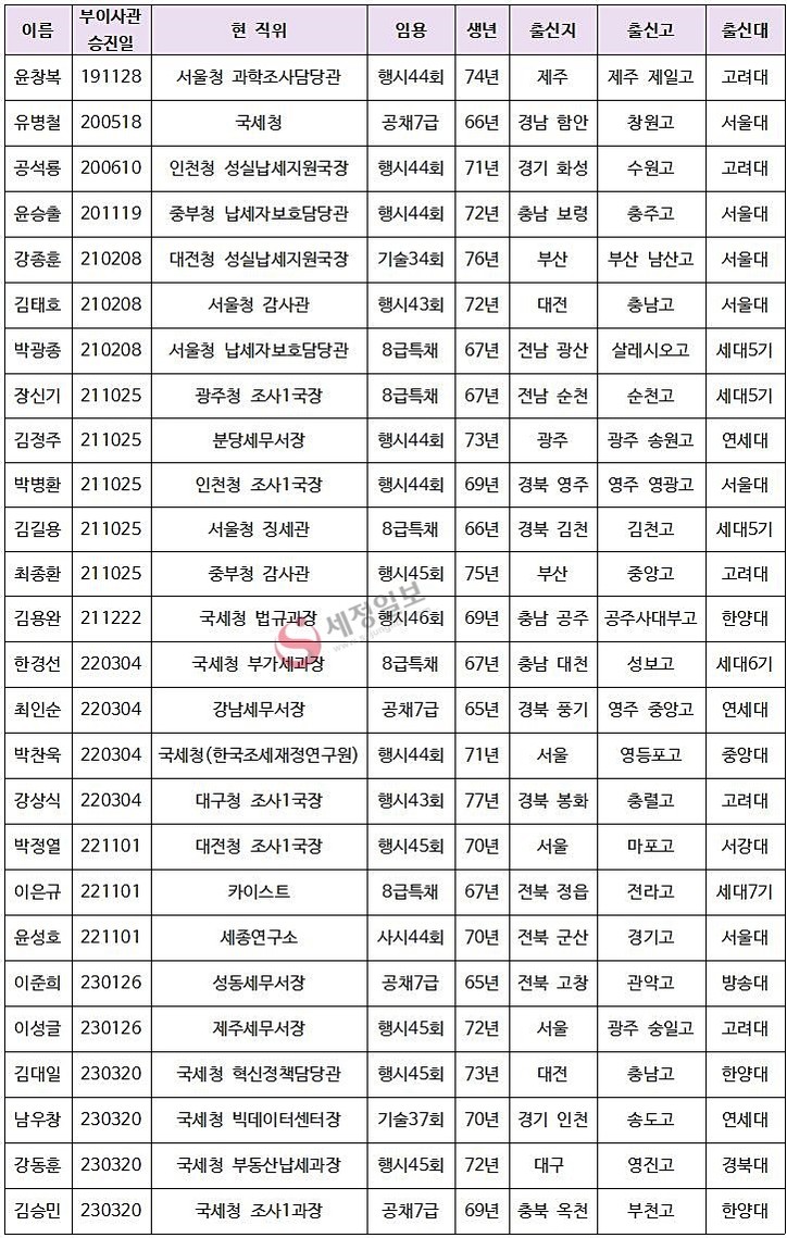 또한 부이사관 승진 만 1년이 지난 이들 중 행시 출신은 박병환 인천청 조사1국장(경북 영주, 행시44회), 김정주 분당세무서장(광주, 행시44회), 최종환 중부청 감사관(부산, 행시45회), 김용완 국세청 법규과장(충남 공주, 행시46회), 박찬욱 한국조세재정연구원 파견(서울, 행시44회), 강상식 대구청 조사1국장(경북 봉화, 행시43회) 등이고, 승진한 지 1년이 되지 않은 이들로는 사법고시 출신의 윤성호 과장(세종연구소 파견)을 포함해 박정열 대전청 조사1국장(서울, 행시45회), 이성글 제주세무서장(서울, 행시45회), 김대일 국세청 혁신정책담당관(대전, 행시45회), 강동훈 부동산 납세과장(대구, 행시45회) 등 3명이 있다.