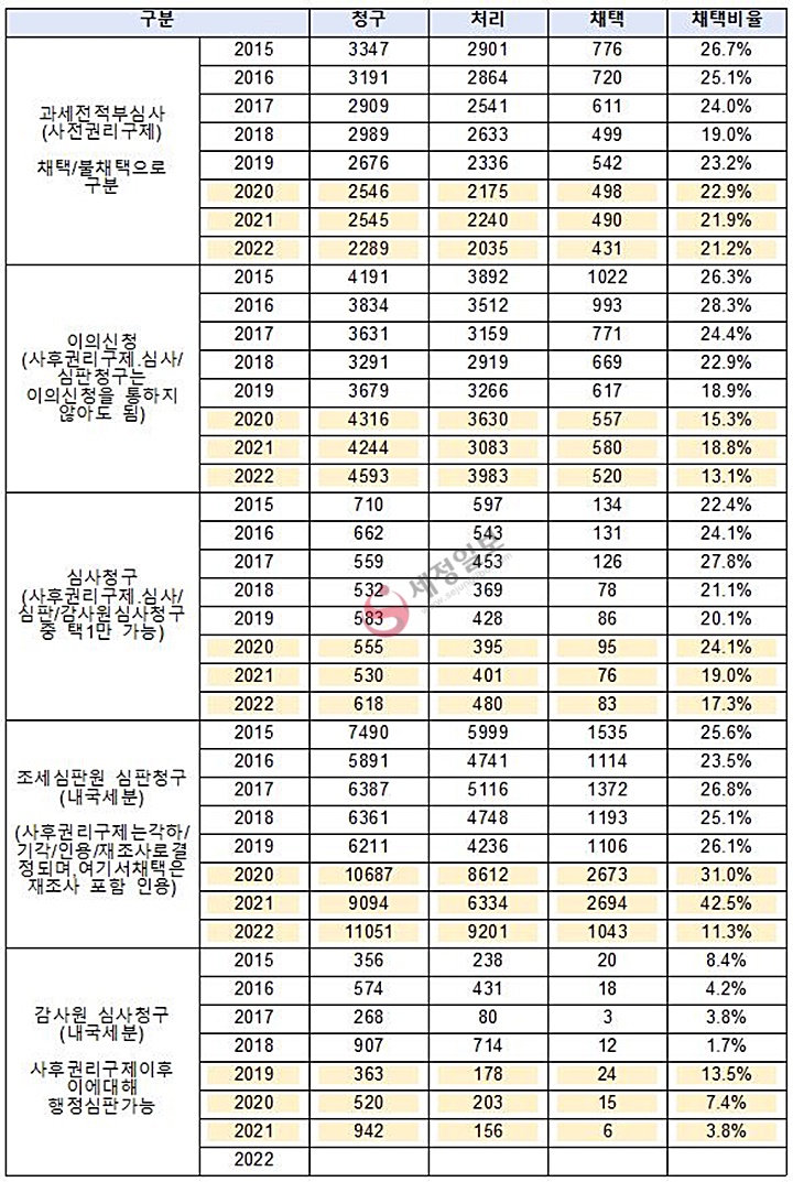 심판청구(재조사 포함)는 같은 기간 31%, 42.5%, 11.3%였으며, 심사청구는 24.1%, 19%, 17.3%, 감사원 심사청구는 13.5%, 7.4%, 3.8%로 기록됐다. 감사원의 인용률이 10%도 채 되지 않는 것이 특징이다. 특히, `20년에는 7.4%의 인용률을 기록했음에도 이듬해 국세청 심사청구에 접수된 불복 건수(530건)보다 감사원에 접수된 불복 청구 건수(942건)가 더 높았다.