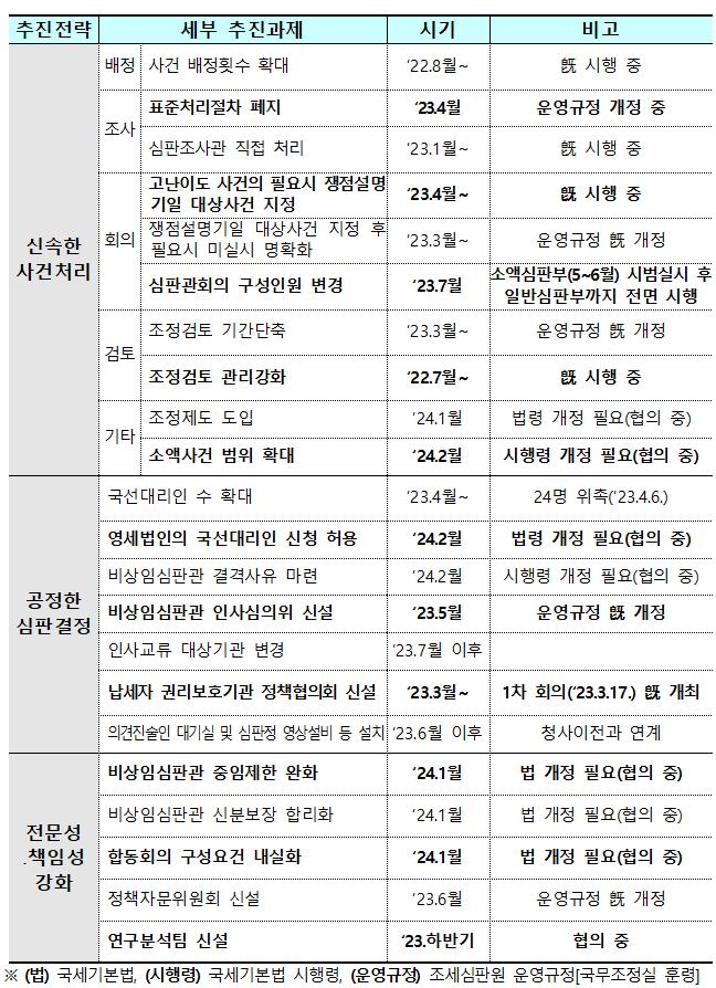 조정검토 기간단축 및 관리강화도 제시됐다. 법령상 조정검토 기간은 30일이나 이를 원칙적으로 20일로 단축하고 필요시 연장하도록 운영되며, 조정팀내 세목별 담당제 도입, 조정담당자 직급 상향 및 결재단계 축소를 통해 전문성에 기반한 신속한 조정검토가 이뤄진다.