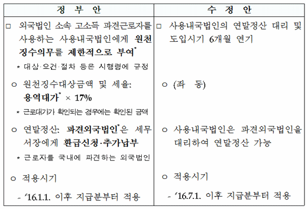 [7]국내파견 고소득 근로자로부터 근로를 제공받는 내국법인에 대한 원천징수의무제도의 도입시기 6개월 연기 등(소득세법 §156의7 신설)