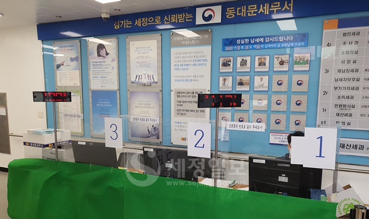 이날 동대문세무서에 방문한 기자는 점심시간이 가까워졌음에도 주차장 그늘막에서 순서를 기다리며 신고 관련 안내를 받은 후 세무서 지하 1층에 마련된 신고창구로 들어서는 납세자를 확인할 수 있었다. 이들은 지상 1층과 지하 1층에 마련된 총 16개 신고창구에서 직원과 신고 도우미 안내를 받아 세액을 확인하고 직접 신고납부하는 모습이었다.
