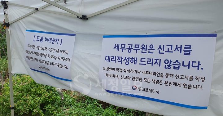청량리 전통시장과 이를 마주보고 있는 고층 오피스텔, 경희대학교나 서울시립대학교 등 대학가와 학원가를 동시에 품은 동대문세무서 종합소득세 신고 현장을 26일 찾았다. 점심시간이 한창인 와중에도 세무서를 직접 찾은 납세자를 배려해 신고창구에는 직원 및 신고 도우미가 이들의 세금 신고를 도와주는 모습이었다.