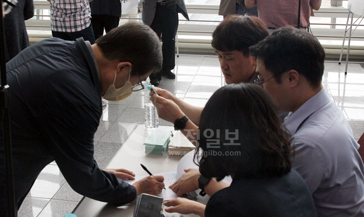 이날 오후 1시부터 오후 3시 30분까지 진행된 선거에는 약 1900명에 달하는 부산지방세무사회 회원 발걸음이 이어졌다. 벡스코 1층에 들어서 에스컬레이터를 타고 오르면 띠를 두른 후보자들과 인사를 나누게 되고, 신분 확인을 마친 후 선거에 임하는 모습이었다.