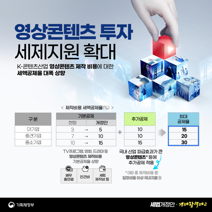 정부가 우리나라 콘텐츠산업의 글로벌 경쟁력 확보를 위해 영상콘텐츠 제작비용에 대한 세액공제율을 대폭 상향한다.