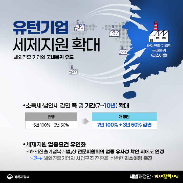 정부는 “국내복귀 유인효과 및 유턴기업 지원세제 유연성 제고를 통한 해외진출기업의 국내복귀 활성화로 국내의 투자·고용 창출이 늘어날 것”이라고 설명했다.