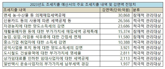 정부의 '2023년도 조세지출예산서' 기준으로, 올해 전체 감면액 69조3천억원의 20.0%에 해당하는 규모다. 즉, 이번 조세지출 연장으로 내년에 최소 13조원대의 세수 증대를 포기한 셈이다.