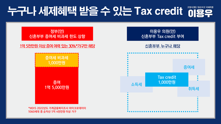 최근 정부가 결혼자금 증여세 비과세 한도를 1인당 5000만 원에서 1억 5000만 원으로 상향하는 세제개편안을 발표한 가운데 모든 신혼부부가 1000~2000만 원의 세제혜택을 받을 수 있는 Tax Credit 제도를 도입해야 한다는 주장이 제기됐다.