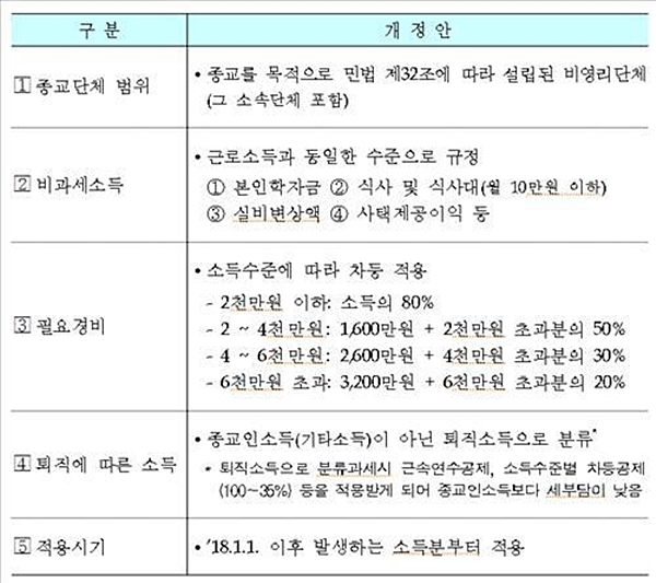 ◇ 종교인 과세 관련 소득세법 시행령 개정안 주요 내용