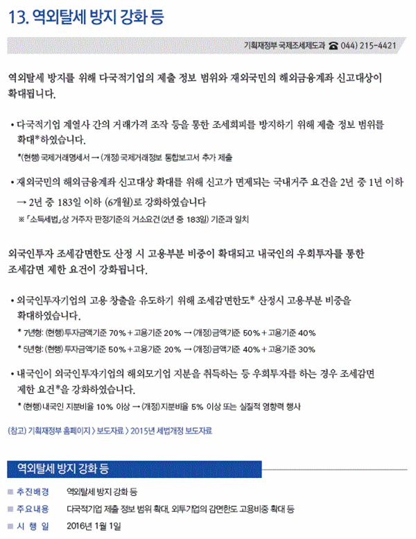 [기획재정부 자료] 유일지 기자 salixy@hanmail.net 기자의 다른기사 저작권자 © 세정일보 무단전재 및 재배포 금지 최신 기사 차규근 “배당소득 분리과세율 인하 수용못한다…초부자 감세, 불평등만 심화” 관세사회, 우원식 국회의장 면담…성실신고확인제 필요성 설명 [현장] ‘국세공무원의 꽃’ `25년 하반기 서기관 승진자 30명에 임명장 수여식 국세청, ‘기획·정보·대변인실’ 사무관 자리 하나씩 늘린다 동아쏘시오그룹, 중대재해 대응 모의훈련 실시···심폐소생술·자동심장충격기 실습 NH농협은행, 2025년 ‘디지털금융 혁신대상‘ 최종 우수사례 선정 韓 3분기 경제성장률 26개국 중 3위…내년 2.3% 전망도 등장 차규근 “배당소득 분리과세율 인하 수용못한다…초부자 감세, 불평등만 심화” 추천기사 국세청, 태광산업 세무조사 ‘인프라·레저 계열사’까지…‘5년 치 장부’ 뒤진다 론스타와 13년 분쟁, 국제투자분쟁에서 최초 ‘대한민국 승’…조세주권 지켰다 국세청, 세무공무원 출신 세무사 등 ‘세금 유튜버’ 전수 확인했다 상속세 과세, 유산취득세로 변경 시 ‘국세청 세무조사 조항’도 바뀐다 '마약의 나라' 되나?…청년층 타깃 클럽마약 '케타민의 급습' 5년간 7.3배 급증 [세미콜론] 아직도 이런 폐습이~…국세청 ‘간부 모시는 날’ 고강도 감찰