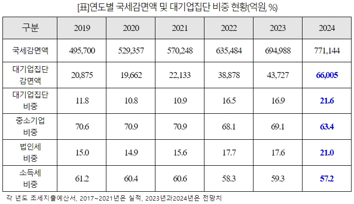 `24년 대기업집단 국세감면액은 6조 6000억 원에 달하는 것으로 나타났다. 이는 올해 대비 51%, `21년 2조 2000억 원 대비 3배 늘어난 수치다.