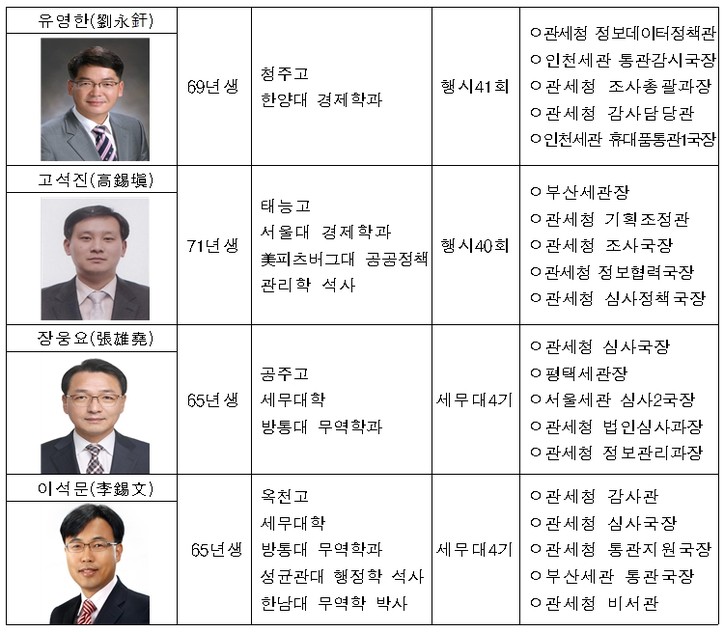 감사관, 통관국장, 부산세관장은 18일자 부임이고, 서울세관장은 20일자 부임이다.