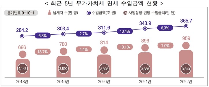 아울러 `22년 부가가치세 면세사업자 수입금액은 365조7000억원으로 5년 전 284조2000억원 대비 28.7%(81조5000억원 늘었고, 업태별로 살펴보면 개인서비스업 95조 원, 보건업 81조6000억원, 도매업 58조9000억원 순으로 높다.