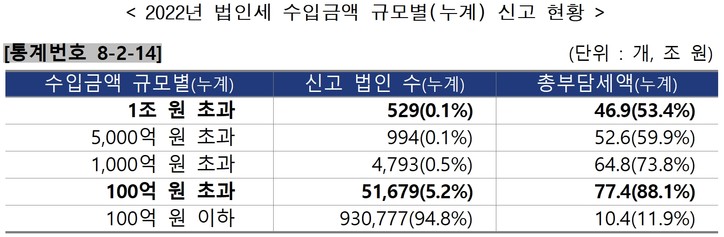 특히 수입금액 1조원을 초과한 법인의 수는 529개, 총 부담세액은 46조9000억원을 차지했다.