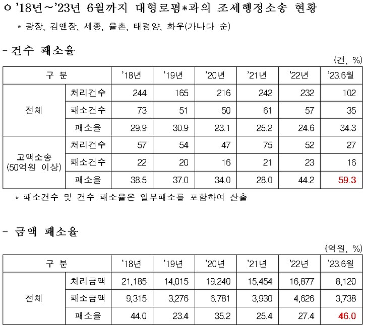 특히 김앤장, 율촌, 태평양 등 6대 대형로펌을 상대로 한 50억 이상 고액소송에서의 패소율은 건수 기준 59.3%로 전체 평균 12.1%의 5배에 달했다. 금액 기준으로 46%로 처리금액 8120억 중 3738억을 패소했다.