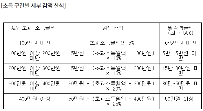 A값 초과 소득이 '400만원 이상'(5구간)이면 50만원 이상을 깎는다.