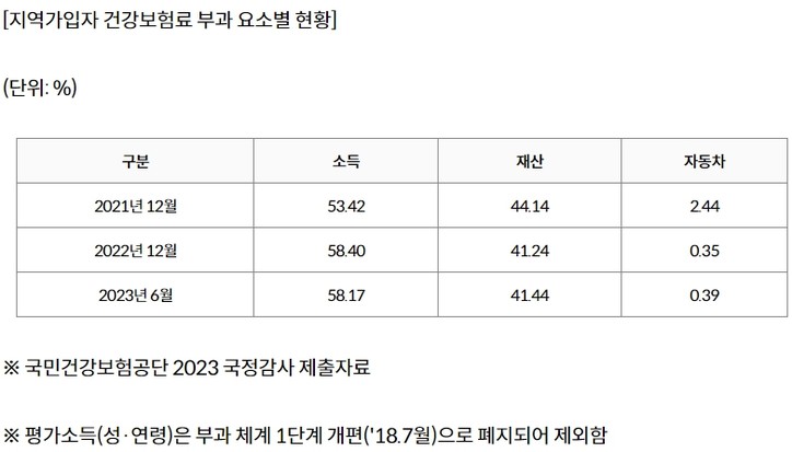 국회 보건복지위원회 남인순 의원이 건강보험공단에서 받은 국정감사 자료를 보면, 2단계 개편 후에도 지역가입자 건보료 부과 요소별 비중은 2023년 6월 현재 소득 58.17%, 재산 41.44%, 자동차 0.39% 등으로 재산과 자동차에 지역건보료를 부과하는 비중이 41.83%에 달할 정도로 높았다.