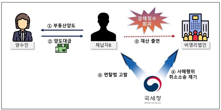 -비영리법인을 상대로 체납자가 출연한 재산(부동산 양도대금 등)에 대해 사해행위취소소송 제기하고 체납자와 비영리법인을 체납처분 면탈범으로 고발