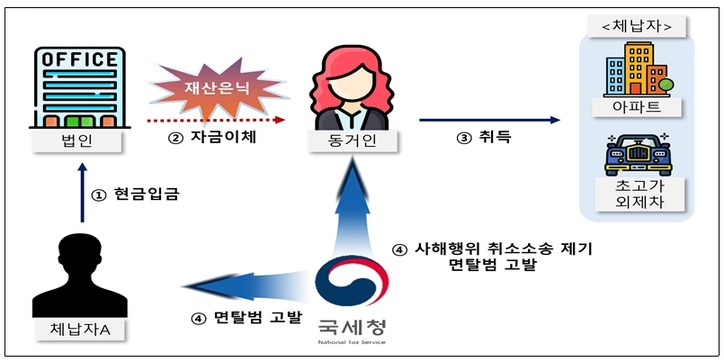 ○제조업을 영위하는 A는 법인자금 유출에 대해 부과된 소득세를 체납하고 본인이 보유하고 있는 자금을 동거인이 대표로 있는 법인의 계좌를 경유하여 동거인에게 이체하는 방식으로 재산 은닉