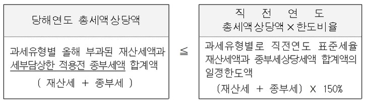 - 직전연도 표준세율 재산세액 및 세부담상한 적용 전 종합부동산세 상당세액 합계액의 150%를 초과하는 경우 그 초과된 세액은 “0”으로 보는 것입니다.