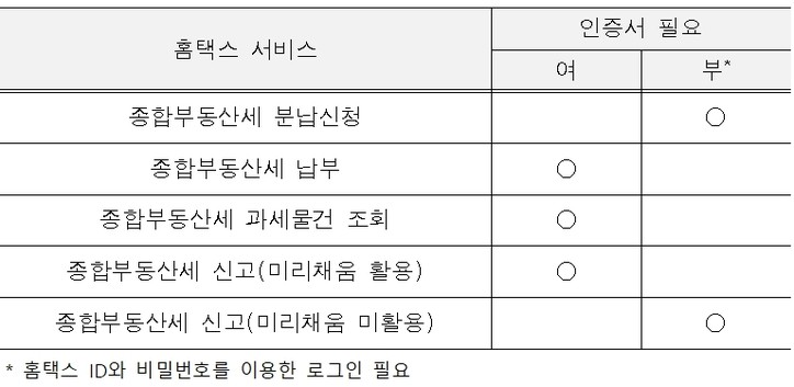 □홈택스에서 제공되는 종합부동산세 관련 서비스 중 인증서 필요여부는 다음과 같습니다.