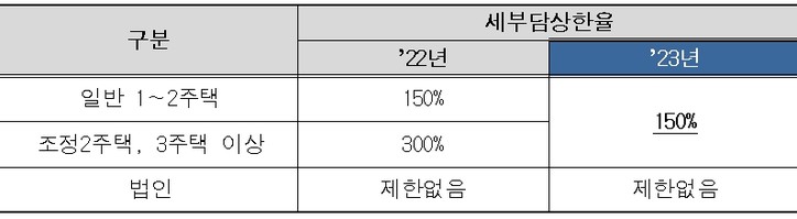 ○다주택자의 세부담상한율을 300% → 150%으로 인하하여 주택 수와 관계없이 동일한 세부담상한율 적용