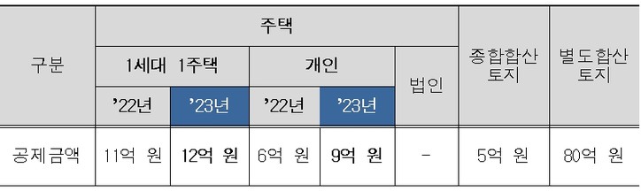 ○일반 납세자의 경우 6억 원 → 9억 원으로, 1세대 1주택자는 11억 원 → 12억 원으로 기본공제금액 상향