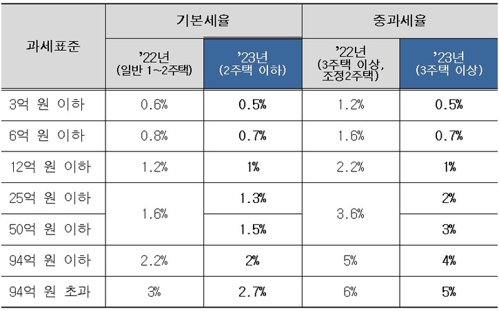 ○조정대상지역 내 2주택자 중과세율은 폐지하고 기본세율로 적용하고, 과세표준 12억 원 이하 구간은 기본세율과 중과세율이 동일
