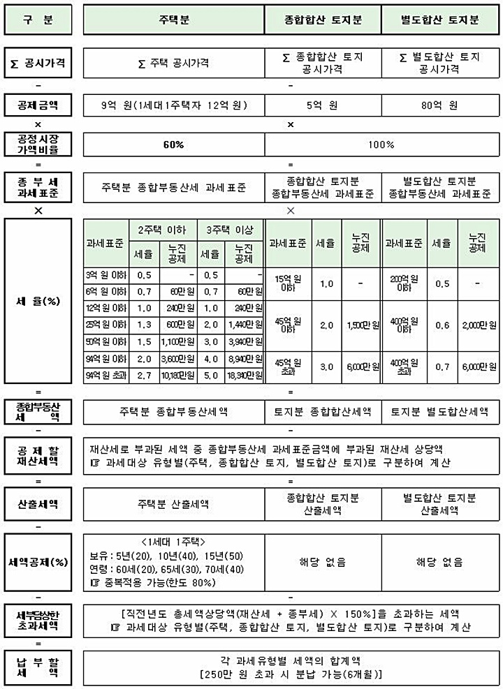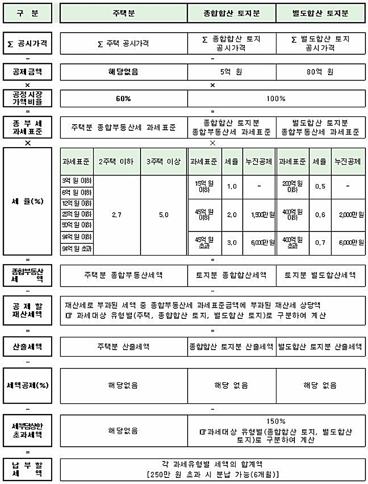 ◆종합부동산세 세액계산 방식[개인] ◆종합부동산세 세액계산 방식[법인] 세정일보 sejungilbo@sejungilbo.com 기자의 다른기사 저작권자 © 세정일보 무단전재 및 재배포 금지 관련기사 국세청, `23년 종부세 50만명에게 발송…고지세액 2조원 감소한 '4조7천억' 최신 기사 차규근 “배당소득 분리과세율 인하 수용못한다…초부자 감세, 불평등만 심화” 관세사회, 우원식 국회의장 면담…성실신고확인제 필요성 설명 [현장] ‘국세공무원의 꽃’ `25년 하반기 서기관 승진자 30명에 임명장 수여식 국세청, ‘기획·정보·대변인실’ 사무관 자리 하나씩 늘린다 동아쏘시오그룹, 중대재해 대응 모의훈련 실시···심폐소생술·자동심장충격기 실습 NH농협은행, 2025년 ‘디지털금융 혁신대상‘ 최종 우수사례 선정 韓 3분기 경제성장률 26개국 중 3위…내년 2.3% 전망도 등장 차규근 “배당소득 분리과세율 인하 수용못한다…초부자 감세, 불평등만 심화” 추천기사 국세청, 태광산업 세무조사 ‘인프라·레저 계열사’까지…‘5년 치 장부’ 뒤진다 론스타와 13년 분쟁, 국제투자분쟁에서 최초 ‘대한민국 승’…조세주권 지켰다 국세청, 세무공무원 출신 세무사 등 ‘세금 유튜버’ 전수 확인했다 상속세 과세, 유산취득세로 변경 시 ‘국세청 세무조사 조항’도 바뀐다 '마약의 나라' 되나?…청년층 타깃 클럽마약 '케타민의 급습' 5년간 7.3배 급증 [세미콜론] 아직도 이런 폐습이~…국세청 ‘간부 모시는 날’ 고강도 감찰