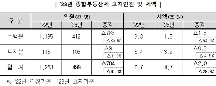 올해 종합부동산세 고지인원 및 고지세액은 총 50만 명, 4조7000억 원이다. 주택분은 41만 명, 1조5000억 원이며, 토지분은 11만 명, 3조2000억 원이다. 주택분 기본공제금액 상향 및 공시가격 하락 등에 따라 `22년 대비 인원은 78만 명, 세액은 2조 원 감소했다.