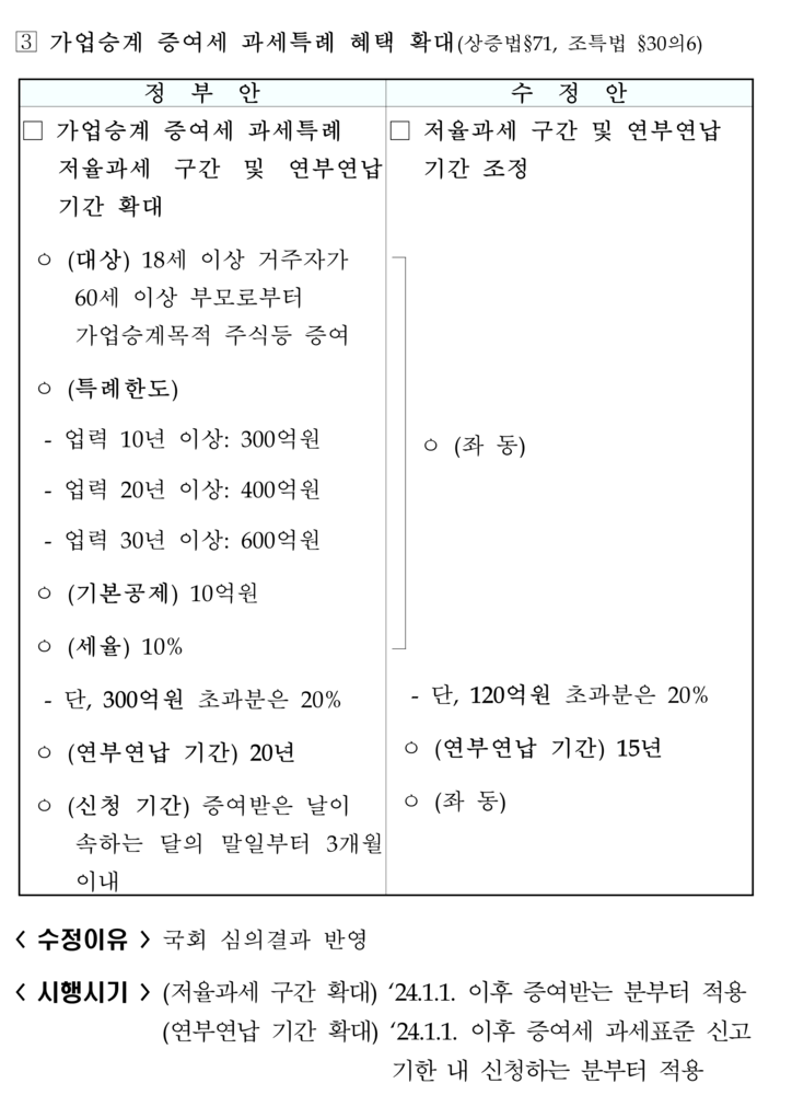 [`23년 세법개정안 정부안 대비 주요 수정내용 상세본] 상속세 및 증여세법 ※ 기획재정부 제공 세정일보 sejungilbo@sejungilbo.com 기자의 다른기사 저작권자 © 세정일보 무단전재 및 재배포 금지 관련기사 국회 기획재정위 통과된 15개 세법개정안 주요내용 최신 기사 차규근 “배당소득 분리과세율 인하 수용못한다…초부자 감세, 불평등만 심화” 관세사회, 우원식 국회의장 면담…성실신고확인제 필요성 설명 [현장] ‘국세공무원의 꽃’ `25년 하반기 서기관 승진자 30명에 임명장 수여식 국세청, ‘기획·정보·대변인실’ 사무관 자리 하나씩 늘린다 동아쏘시오그룹, 중대재해 대응 모의훈련 실시···심폐소생술·자동심장충격기 실습 NH농협은행, 2025년 ‘디지털금융 혁신대상‘ 최종 우수사례 선정 韓 3분기 경제성장률 26개국 중 3위…내년 2.3% 전망도 등장 차규근 “배당소득 분리과세율 인하 수용못한다…초부자 감세, 불평등만 심화” 추천기사 국세청, 태광산업 세무조사 ‘인프라·레저 계열사’까지…‘5년 치 장부’ 뒤진다 론스타와 13년 분쟁, 국제투자분쟁에서 최초 ‘대한민국 승’…조세주권 지켰다 국세청, 세무공무원 출신 세무사 등 ‘세금 유튜버’ 전수 확인했다 상속세 과세, 유산취득세로 변경 시 ‘국세청 세무조사 조항’도 바뀐다 '마약의 나라' 되나?…청년층 타깃 클럽마약 '케타민의 급습' 5년간 7.3배 급증 [세미콜론] 아직도 이런 폐습이~…국세청 ‘간부 모시는 날’ 고강도 감찰
