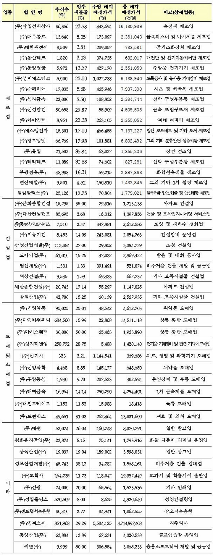 이 외에도 이번 매각추진대상 증권에는 매각예정가격이 100억대 이상인 곳으로는 교학사가 194억원, 남일전지상사 161억원, 디앤비컴퍼니 145억원, 트랜덱스가 130억원 등이다.