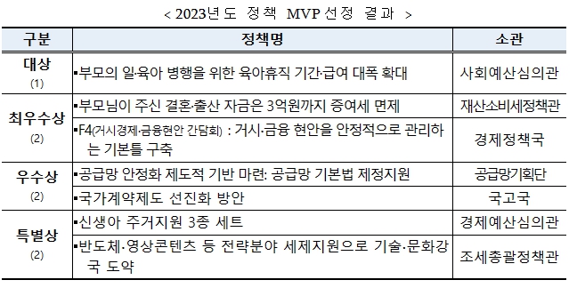 ▶부모님이 주신 결혼·출산 자금은 3억원까지 증여세 면제 ▶반도체·영상콘텐츠 등 전략분야 세제지원 정책이 `23년 기획재정부가 선정한 `23년 정책 MVP 부문에서 ‘최우수상과 특별상’을 받았다.
