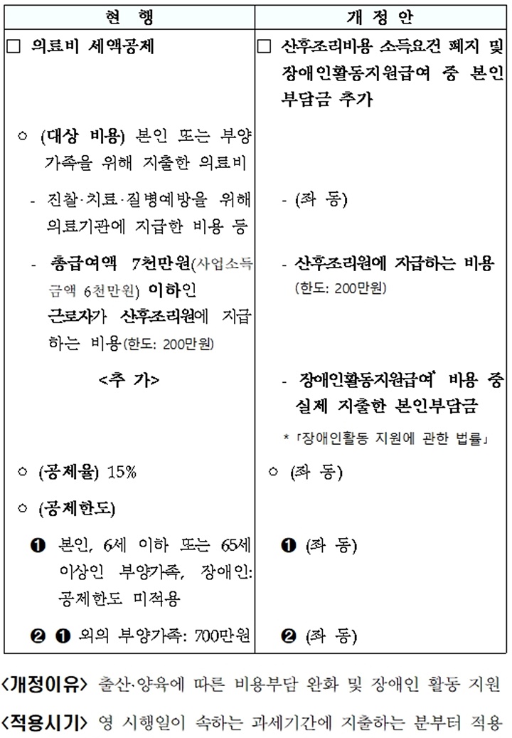 산후조리비용에 대한 의료비의 경우 본인 및 기본공제대상자를 위해 지출한 의료비로서 총급여액의 3%를 초과한 금액의 15%(미숙아·선천성이상아 의료비: 20%, 난임시술비: 30%)를 세액공제하고 있다. 정부는 적용대상을 총급여액 7000만원 이하 근로자에서 모든 근로자로 확대키로 했다.