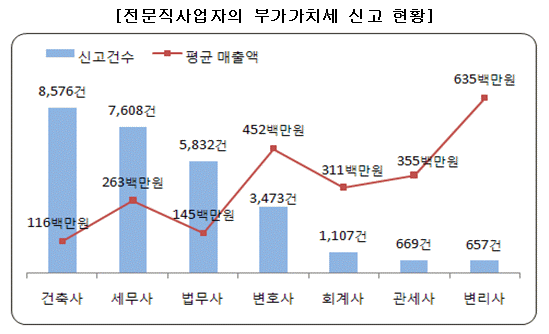 이 자료에 따르면 세무사에 이어 법무사가 1억4500만원, 건축사는 1억1600만원의 매출을 올린 것으로 나타났다.