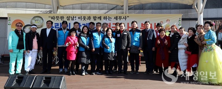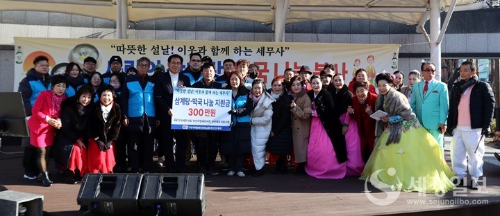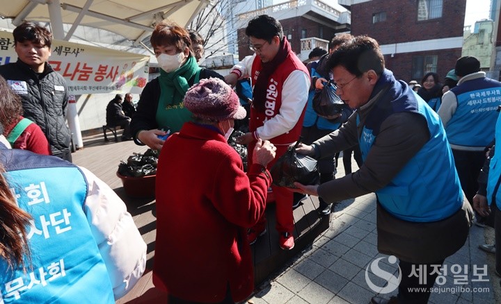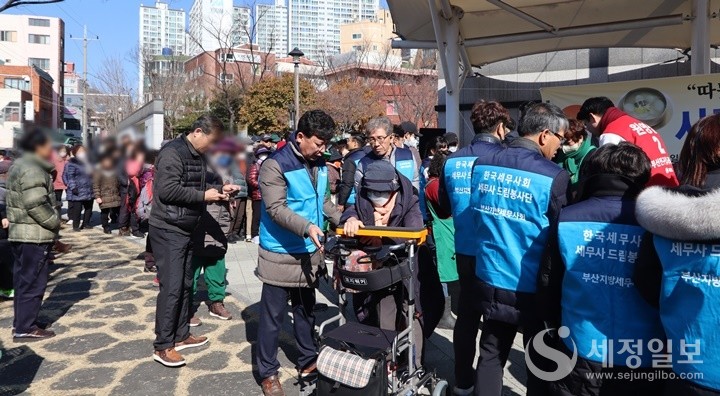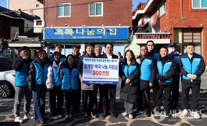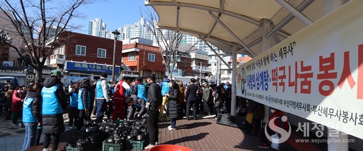 부산지방세무사회가 부산진구 연지어린이공원에서 초록봉사단에 성금 300만 원을 전달하고 “설맞이 사랑의 삼계탕·떡국 나눔 봉사”활동을 했다.