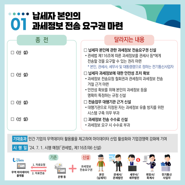 과세정보 전송 요구권이 신설되면 본인뿐만 아니라 관세사, 관세법인, 세무사, 세무법인, 변호사, 회계사 등 대리인 또는 전기통신사업자 등에게 정보를 제공해 납세자의 편의가 높아지고 기업의 경우 무역데이터 활용률이 제고되는 등 기업경쟁력 강화가 이루어질 것으로 기대되고 있다.
