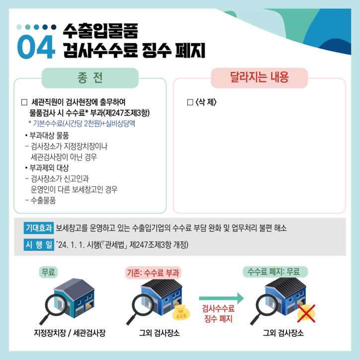 이 외에도 세관직원이 세관검사장이 아닌 장소에서 물품을 검사하는 경우 신고인에게 부과되는 수출입물품 검사 수수료를 폐지해 보세창고를 운영하고 있는 수출입기업의 수수료 부담을 완화하는 등 수출입 기업에 대한 지원이 이루어진다.
