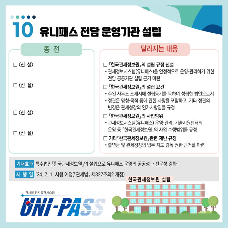 또한 오는 7월부터 현행 관세정보시스템인 ‘유니패스’의 운영을 민간위탁(지정사업자 제도) 방식에서 공공기관 운영방식으로 전환해 운영할 수 있는 법적 근거를 마련한다.