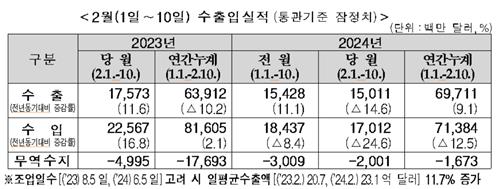 13일 관세청에 따르면 2월 1∼10일 수출액(통관 기준 잠정치)은 150억1천100만달러로 작년 같은 기간보다 14.6% 감소했다.