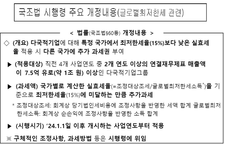 국내 기업들은 올해부터 적용된 글로벌 최저한세 제도에 따라 해외 자회사가 낸 세금(실효세율 기준)이 15% 이하일 경우 모기업이 15%에 부족한 부분을 우리나라 정부에 추가로 납부해야 한다. 정부는 올해 기업 재무제표를 기준으로 2026년 6월 말(당해연도 종료 후 18개월 이후)에 추가 세액을 거둘 예정이다.